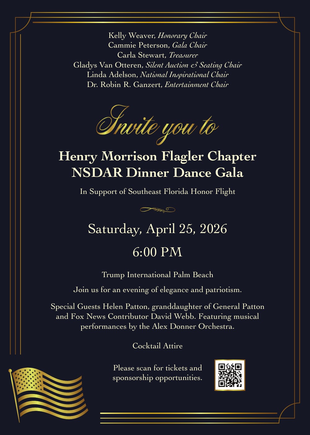 The Henry Morrison Flagler Chapter, NSDAR Dinner Dance Gala will be held on Saturday, April 25, 2026, at 6:00 PM at Trump International Golf Club, West Palm Beach. This elegant evening will support Southeast Florida Honor Flight and our mission of honoring veterans with trips to Washington, DC to visit the memorials built in tribute to their service.